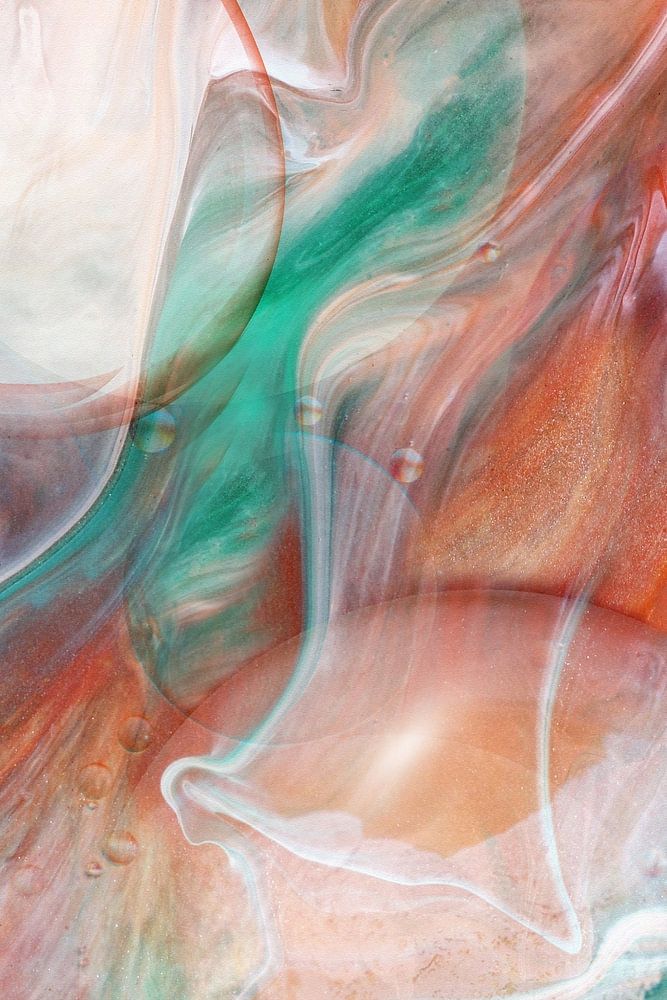 Buntes abstraktes Mixed-Media-Gemälde mit Wassertropfen und fließenden Formen in hauptsächlich grünen, orangen und türkisen Tönen