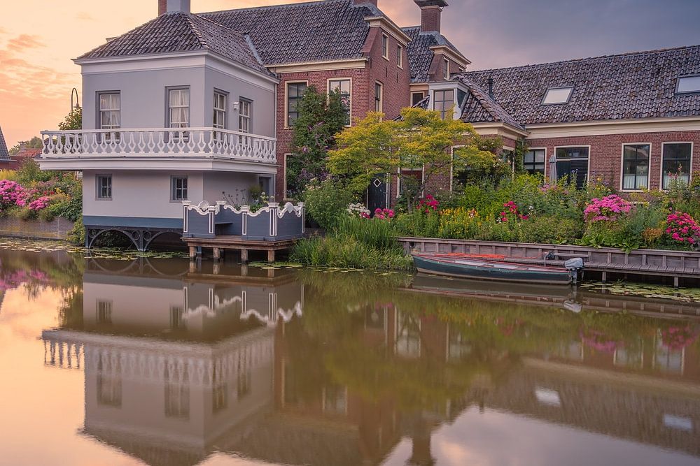Dieses stimmungsvolle Foto zeigt das ehemalige Kantonsgericht von Onderdendam, das wunderschön am Boterdiep in der Provinz Groningen liegt. An einem Sommerabend wird das stattliche Gebäude vom warmen Licht der untergehenden Sonne angestrahlt, während der farbenfrohe Garten und die blühenden Sträucher die Szene einrahmen. Die Spiegelung im stillen Wasser verstärkt das Gefühl von Frieden und Harmonie. Ein Bild, das Geschichte, Architektur und Landschaft vereint - perfekt als Wandschmuck für Liebhaber charaktervoller Orte im Norden der Niederlande.