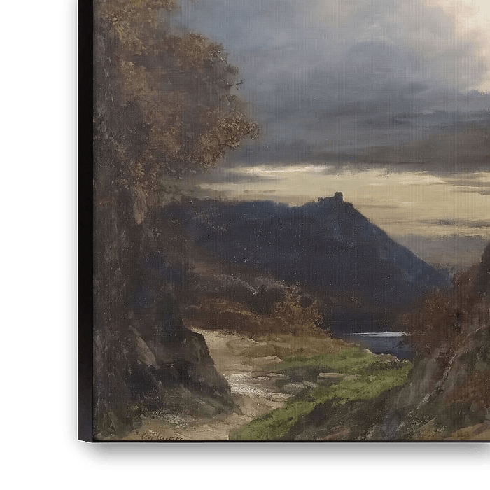 Der Himmel ist ein Meisterwerk für sich, und Flamms geschickte Pinselstriche fangen die ätherische Schönheit der Abendwolken ein. Warme Orange- und kühle Blautöne vermischen sich zu einem atemberaubenden Farbenspiel, das sich auf der Oberfläche des Flusses spiegelt und der Szene eine traumhafte Qualität verleiht.