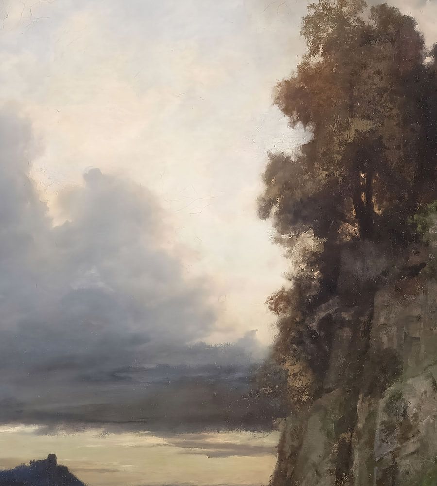 Das rechte Ufer wird von einem grünen Hügel dominiert, dessen Hänge mit üppigem Laub bedeckt sind, das bei abnehmendem Licht von satten Grüntönen in tiefere, gedämpftere Töne übergeht. Verstreut stehende Bäume, deren Äste in den Himmel ragen, sorgen für ein harmonisches Zusammenspiel von Natur und bebauter Umwelt.