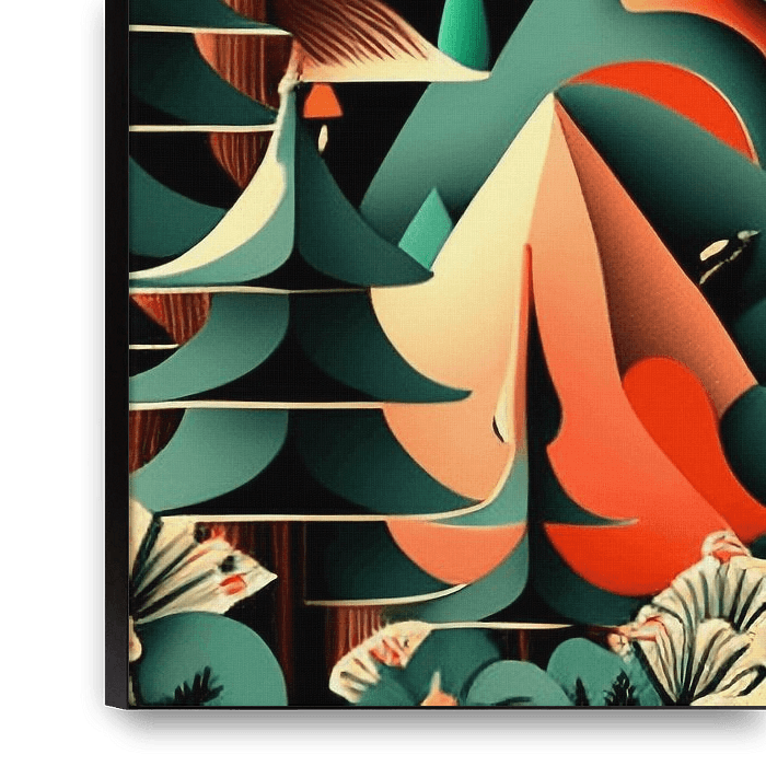 Dieses digitale Kunstwerk stellt eine stilisierte Berglandschaft mit einer surrealen und modernen Ästhetik dar. Die hoch aufragenden Gipfel sind scharf umrissen und zeichnen sich durch kühne geometrische Formen und dramatische, fließende Linien aus. Die Berge sind von einem dichten Wald aus stilisierten Bäumen umgeben, von denen jeder…