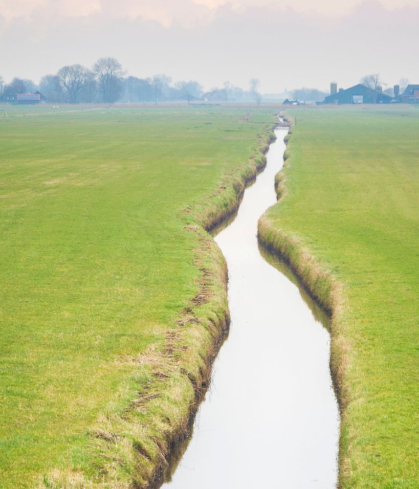 Weite Polderlandschaft mit einem Graben, der die Wiese durchschneidet