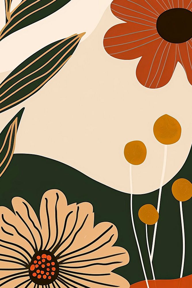 Diese wunderschöne abstrakte Blumenillustration kombiniert warme Rot-, Orange- und Grüntöne mit kühnen Linien und Formen. Die verspielte und doch raffinierte Komposition bringt einen Hauch von Natur und Modernität in Ihr Interieur. Perfekt für Liebhaber von botanischer Kunst und minimalistischem Design. Bringen Sie mit dieser einzigartigen Wanddekoration einen Hauch von Lebendigkeit in Ihr Wohnzimmer, Schlafzimmer oder Büro.