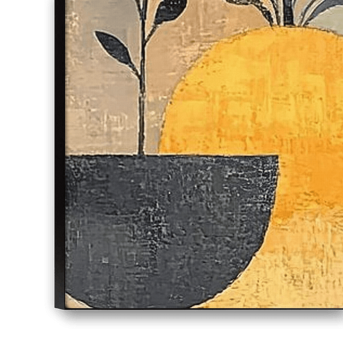 Abstrakte Blumenarrangements mit Vogel - Dieses moderne Gemälde zeigt einen schwarzen Vogel, der auf einem Stein steht, umgeben von bunten Topfblumen und abstrakten Formen, die dem Kunstwerk einen lebendigen und fröhlichen Look verleihen.