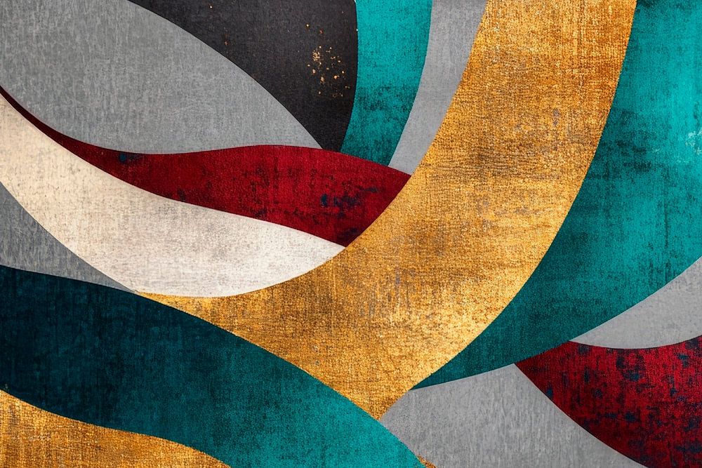 Ein harmonisches Spiel aus geschwungenen Linien in leuchtenden Farben entfaltet sich vor dem Betrachter. Die Kombination aus sattem Rot, tiefem Gold und beruhigendem Türkis sorgt für eine dynamische Atmosphäre. Ideal für ein modernes Wohnzimmer, verleiht dieses Kunstwerk jedem Raum einen kreativen Akzent und lädt zum Verweilen ein.