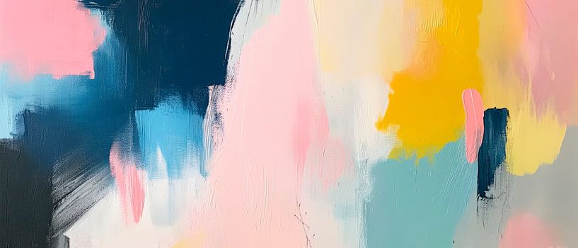 Sanfte Farbströme in zartem Rosa, lebhaftem Gelb und tiefem Blau vereinen sich in einem harmonischen Tanz. Die dynamischen Pinselstriche laden zum Träumen ein und bringen eine anregende Ruhe mit sich. Perfekt geeignet für das Wohnzimmer, wo Kreativität und Entspannung aufeinandertreffen und jeden Raum mit positiver Energie erfüllen.