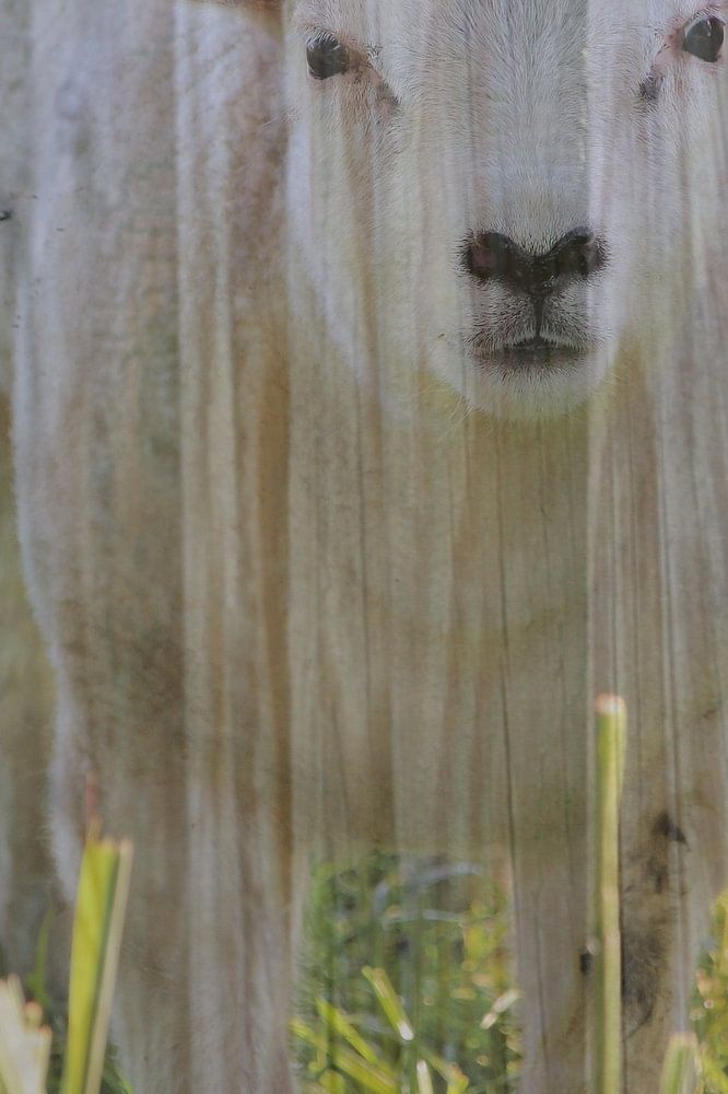 Porträt eines Lamms... ein neugieriges Lamm, das erwartungsvoll neben seiner Mutter steht. Eine fröhliche Frühlingsstimmung für jede Wand.