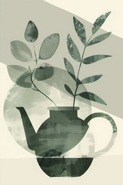 Die abstrakte Garten-Teekanne ist ein wunderschönes Set aus einer Teekanne mit grünen Zweigen. Die Formen sind geschichtet und teilweise transparent, so dass sie schön subtil ineinander übergehen. Zwei Farben, zartes Beige und Salbeigrün, wurden in dunkler und heller Stärke verwendet. Die kleinen Texturdetails und weichen Übergänge…
