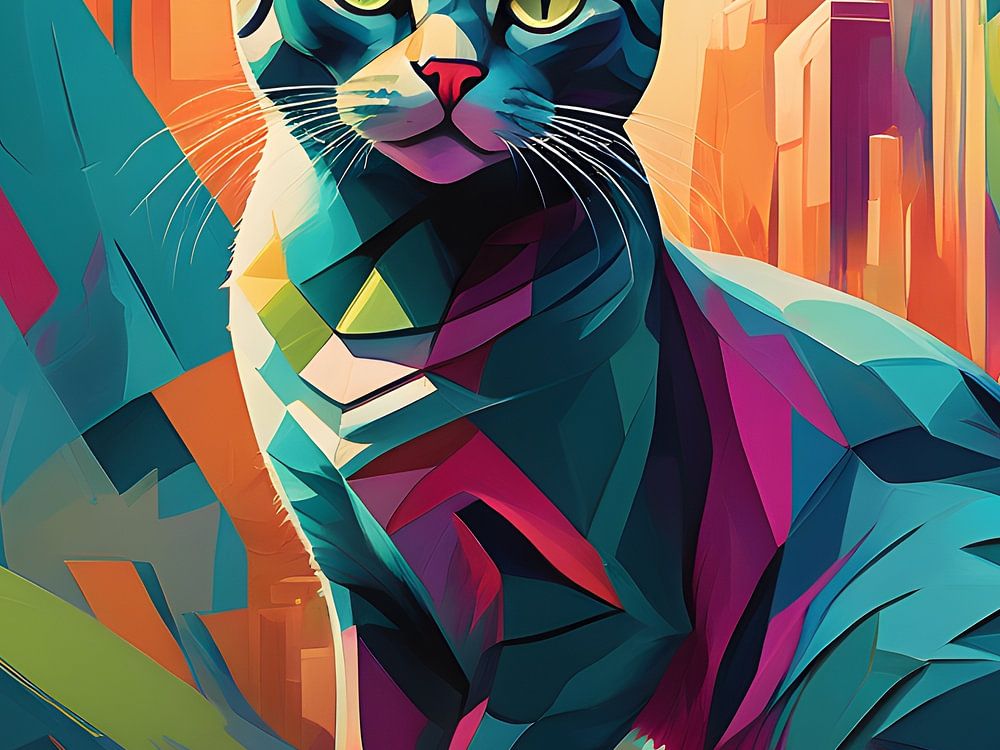 Dieses Kunstwerk zeigt eine Katze, die stattlich vor einem städtischen, geometrischen Hintergrund posiert. Die leuchtenden Farben und scharfen Linien verleihen dem Werk eine moderne und dynamische Ausstrahlung. Der Stil erinnert an den Kubismus, bei dem Formen und Perspektiven auf abstrakte Weise wiedergegeben werden. Auch Einflüsse der Pop Art sind in den leuchtenden, kontrastreichen Farben und der Verwendung von Alltagssujets in einem künstlerischen Kontext zu erkennen.