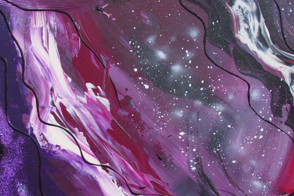 Ein Gemälde aus dem Bereich der abstrakten Kunst in wunderschönen Lila- und Rottönen. Eine abstrakte Darstellung des Kosmos und der Galaxie.