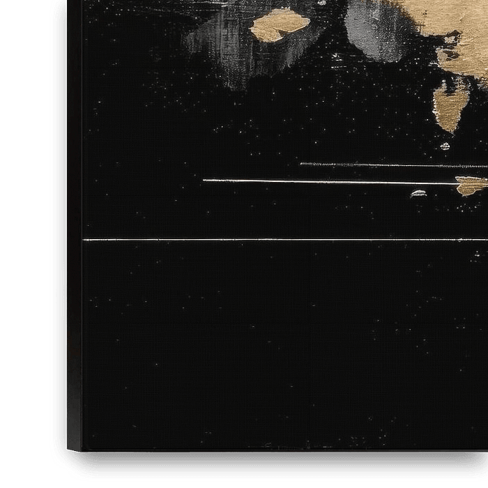 Dieses abstrakte Gemälde zeigt eine menschliche Silhouette, die durch eine abstrakte Landschaft geht, mit einem starken Kontrast aus tiefem Schwarz und sanftem Weiß. Raue Farbstrukturen, horizontale Linien und verwitterte Schichten schaffen eine urbane, fast filmische Atmosphäre, während unregelmäßige goldene Akzente als Bruchstellen in…