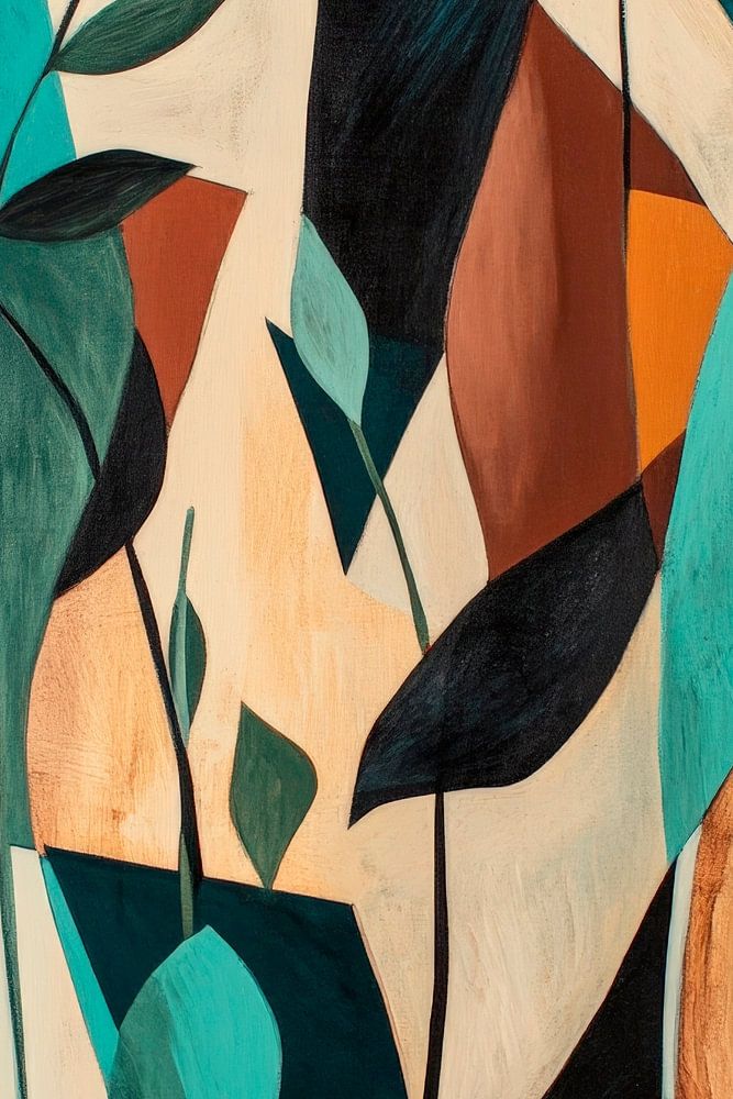 Ein harmonisches Spiel aus geschwungenen Formen und lebendigen Farben verleiht diesem Kunstwerk eine frische, zeitgenössische Note. Die stilisierten Blätter in sanften Tönen von Blau, Grün und Erdtönen strahlen eine beruhigende Eleganz aus. Perfekt für das Wohnzimmer, um eine entspannende Atmosphäre zu schaffen und kreative Gesprächsstoffe zu liefern.