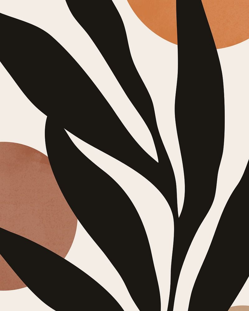 Abstrakte minimalistische Illustration einer Pflanze in Kombination mit Kreisen. Die Naturtöne verleihen ihm einen echten Boho-Stil. Die Kreise haben eine dezente weiße Farbstruktur. Der Hintergrund ist hellbeige.