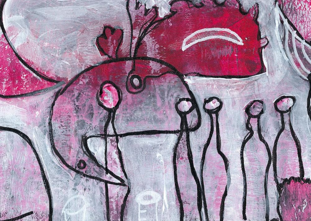 Dieses Gemälde mit abstrakten und figurativen Vögeln, Menschen und Figuren in Rot und Weiß ist auf Leinwand gemalt.
