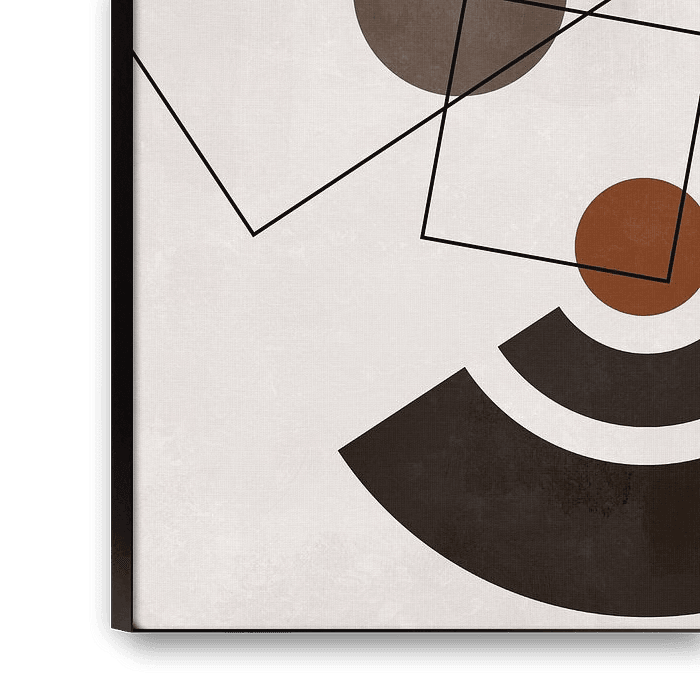 Grafische Illustration mit abstrakten Formen in Dunkelbraun, Braun und Rot auf taupefarbenem Hintergrund und sich überlappenden, in Schwarz gezeichneten Kreisen und Quadraten. Dieses moderne geometrische Kunstwerk im skandinavischen Stil ist eine schöne Ergänzung für jede Einrichtung.