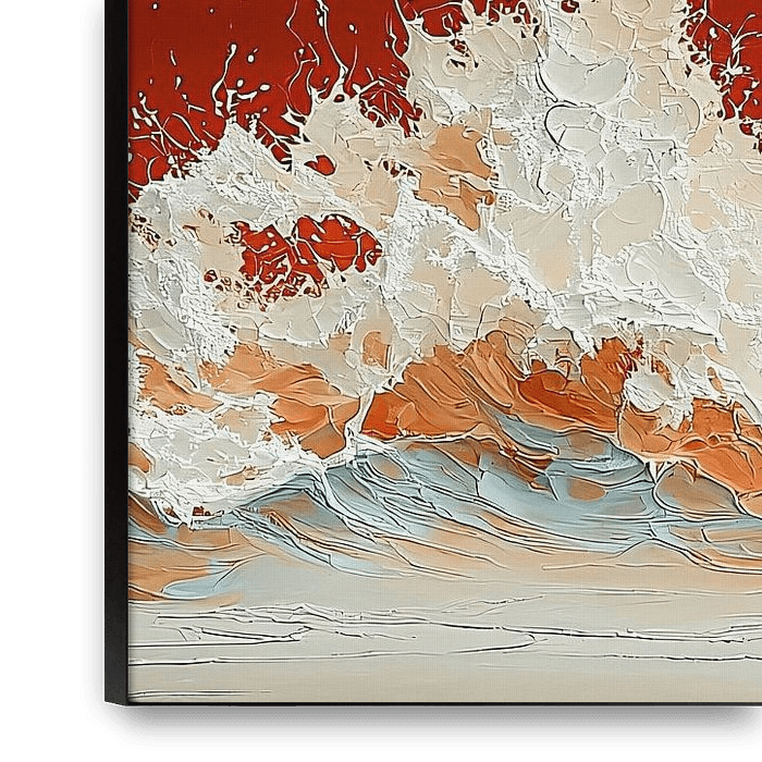 Dieses auffällige Design zeigt eine kraftvolle Welle, die in einer satten Farbkombination aus Orange und Weiß zum Leben erwacht. Die Texturen und Details vermitteln ein Gefühl von Bewegung und Energie und machen es zu einer perfekten Wahl für moderne Innenräume, die ein Statement setzen wollen. Die Kombination aus warmem Orange und…