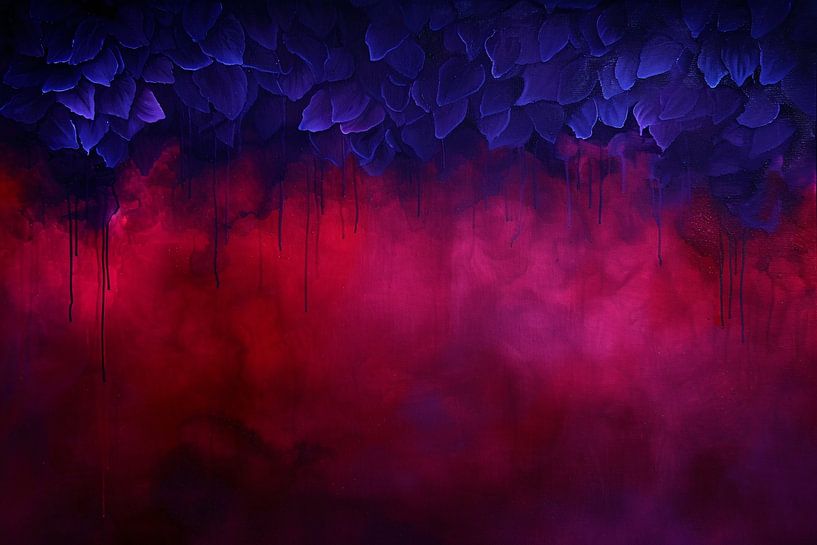 Bestelle dieses abstrakte Wandbild Abstrakter lila und roter Rauch mit Blättern von Art & Soul Creations als Reproduktion auf Leinwand, Alu-Dibond, als Poster, Fototapete oder Acrylglasbild.