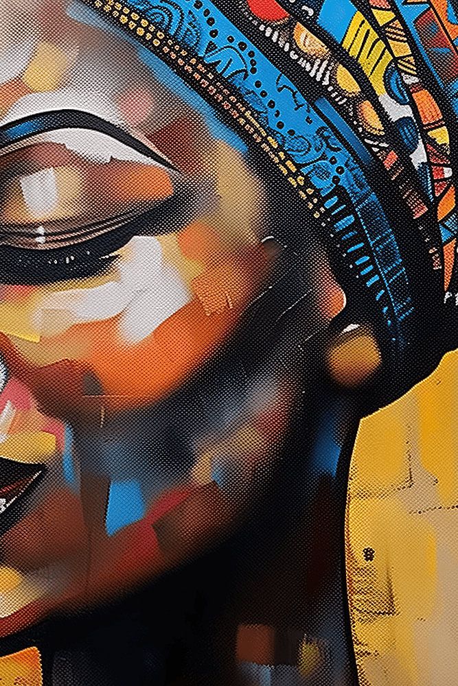 Dieses lebendige und farbenfrohe Bild zeigt ein schönes Porträt einer Frau, die ein detailliertes und auffälliges Kopftuch trägt. Der Malstil kombiniert Realismus mit abstrakten Elementen, wobei die Hauttöne in verschiedenen leuchtenden Farben wiedergegeben werden, was eine dynamische und ausdrucksstarke Wirkung erzeugt. Das Kopftuch ist mit einem komplexen Muster aus geometrischen Formen und leuchtenden Farben verziert, das ein Gefühl von Kultur und Identität hervorruft. Der Hintergrund ist eine Mischung aus warmen Tönen und abstrakten Pinselstrichen, die die Aufmerksamkeit auf das Gesicht und das Kopftuch lenken.