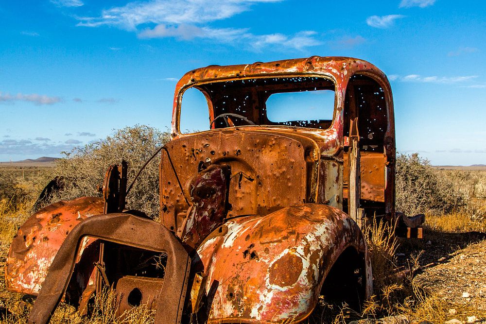 Autowrak dat al jaren ligt te roesten in de woestijn, in al zijn ellende nog altijd indrukwekkend!