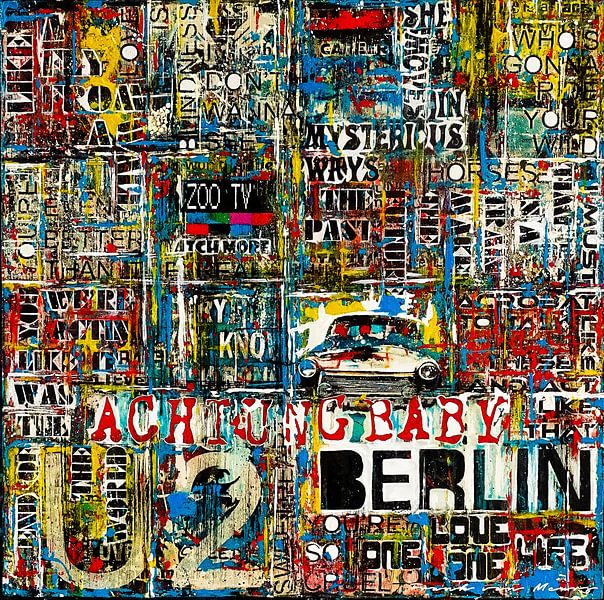 Das Mixed-Media/Collage-Gemälde "Achtung Baby" ist von dem gleichnamigen Album und der Kunststadt Berlin inspiriert. Es besteht aus mehreren Schichten von Drucken, Farben und Lacken. Ich habe versucht, die alternative und kreative Atmosphäre Berlins und die Musik in das Bild zu integrieren.
