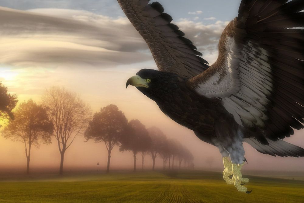 Adler in der Landschaft hs: Der Adler kommt hauptsächlich in Europa, Afrika und Asien vor. Es gibt nur sehr wenige in Amerika. Der Adler in diesem Werk ist ein 1 Jahr alter Seeadler, ein erwachsener Adler hat den berühmten weißen Federkopf, den amerikanischen Adler.