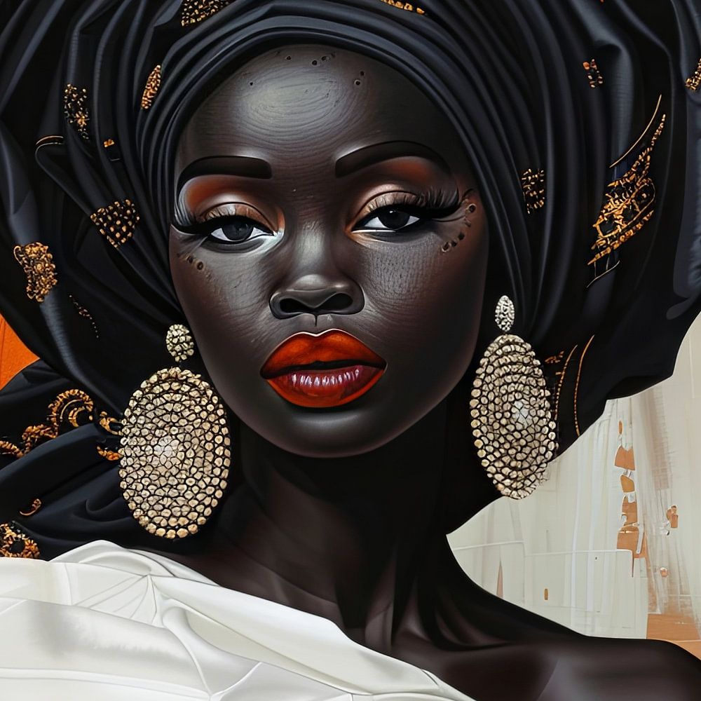 Diese atemberaubende Darstellung einer afrikanischen Frau vereint traditionelle Schönheit und modernen künstlerischen Ausdruck. Mit leuchtend goldenen Akzenten und einem majestätischen schwarzen Kopftuch verkörpert sie Stolz und Anmut. Die kontrastreichen Farben, kombiniert mit den fein gearbeiteten Details ihres Schmucks und ihrer Kleidung, schaffen ein fesselndes visuelles Erlebnis. Die Einflüsse von Kultur und Kunst verschmelzen zu einem kraftvollen Bild, das sowohl zeitlos als auch modern ist.