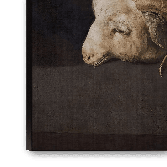 Agnus Dei" oder "Lamm Gottes" ist ein Meisterwerk der religiösen Kunst des spanischen Malers Francisco de Zurbarán aus dem Goldenen Zeitalter. Dieses kraftvolle und stille Gemälde, das um 1635-1640 entstand, ist ein tiefes Symbol des christlichen Glaubens. Es zeigt einen Schafbock mit gefesselten Beinen, der auf einer nackten Steinplatte vor einem fast schwarzen, farblosen Hintergrund liegt.