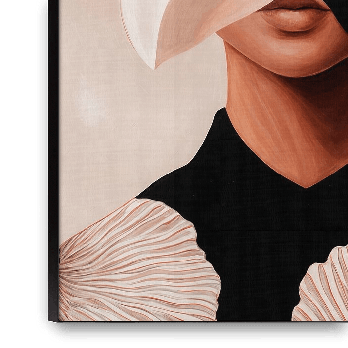 Modernes abstraktes Kunstwerk einer Frau mit Blumen in schönen weichen, nackten Farben. Schwarz, Weiß, Beige und Blassrosa. Passt wunderbar in ein modernes Interieur. Kombinieren Sie es mit Farbe oder einfach mit Farben aus derselben Farbpalette.
