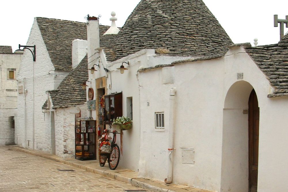 Gruppe schöner Trulli, traditioneller apulischer Trockensteinhäuser mit konischem Dach in Alberobello, Italien