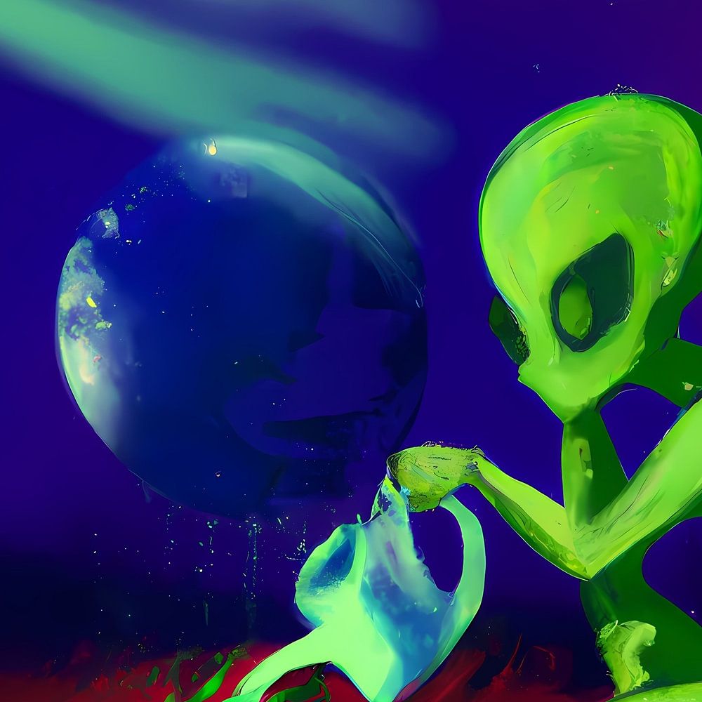 Der Außerirdische gießt seine Pflanzen mit Blick auf das Universum und die Erde.