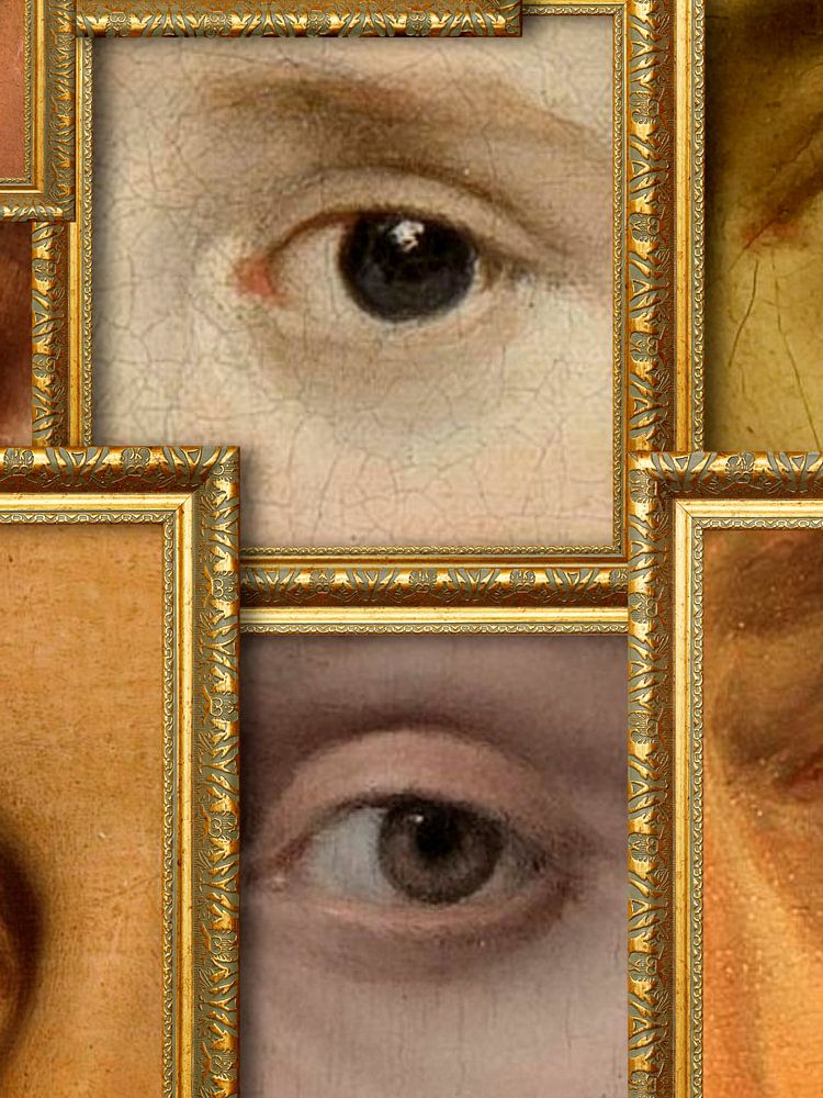 Eine Collage aus Fragmenten aus Gemälden aus dem Rijksmuseum in Amsterdam, Niederlande. Augen in goldenen Zierrahmen.