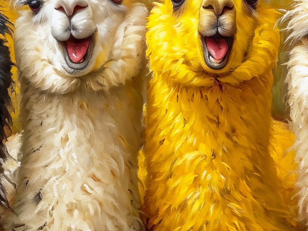 Ein lustiges Wandbild als humorvolle dekorative Kunst für die stilvolle Raumgestaltung - wenn Alpakas Spaß haben