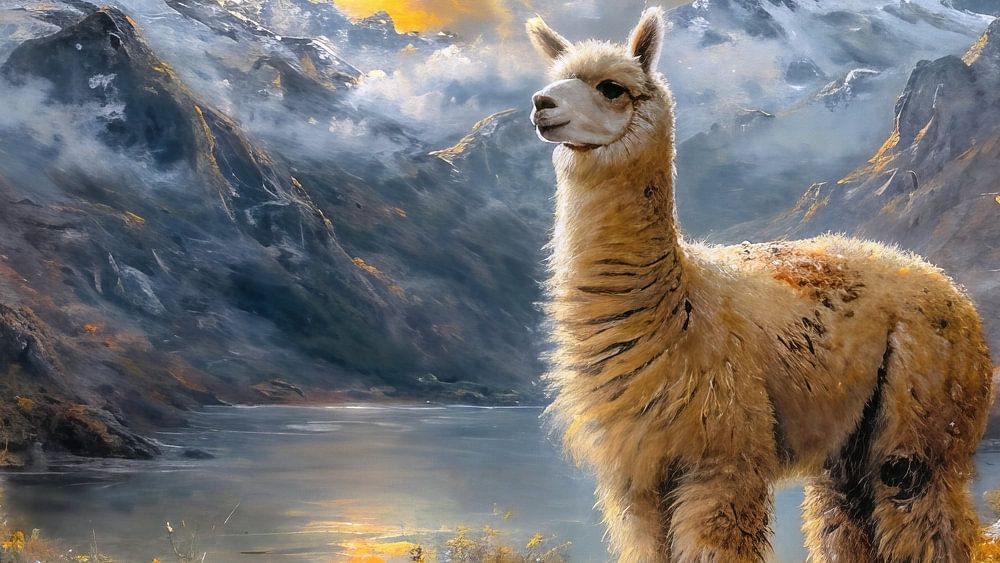 Ein Wandbild als dekorative Kunst für die stilvolle Raumgestaltung. Ein Alpaka im Herbst vor einem Bergsee, umgeben von den schneebedeckten Bergen der peruanischen Anden.