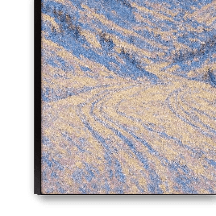 Die Stille eines schneebedeckten Tals entfaltet sich wie ein geflüstertes Geheimnis. Zwischen den schattigen Bergkämmen und der blass aufgehenden Sonne wird der Winter nicht kalt, sondern leuchtend. Dieses Werk, das von der Palette und der Vision Claude Monets inspiriert ist, stellt die Alpen als eine Symphonie der Farbharmonie dar - violette Schatten, die in weiche Cremetöne und eisige Blautöne übergehen, der Horizont mit leisem Gold überzogen. Jeder Strich fühlt sich lebendig und rhythmisch an und atmet im Einklang mit den Bergen selbst.