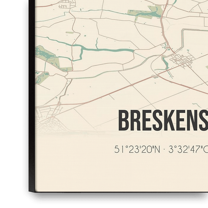 Retrokarte von Breskens, gelegen in der Gemeinde Sluis, Provinz Zeeland. Die Karte zeigt öffentliche Straßen, Wasserläufe (Seen, Bäche und Gräben) und Wälder in und um Breskens. Darüber hinaus enthält die Karte die Koordinaten von Breskens.