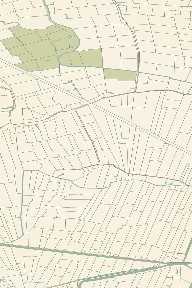 Retrokarte von Den Horn, in der Gemeinde Westerkwartier, Provinz Groningen, gelegen. Die Karte zeigt öffentliche Straßen, Wasserläufe (Seen, Bäche und Gräben) und Wälder in und um Den Horn. Darüber hinaus enthält die Karte die Koordinaten von Den Horn.