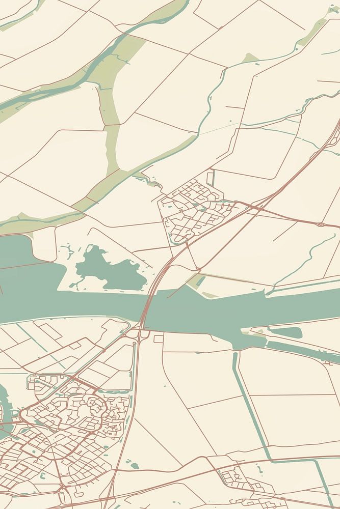 Retrokarte von Hank, gelegen in der Gemeinde Altena, Provinz Nordbrabant. Die Karte zeigt öffentliche Straßen, Wasserläufe (Seen, Bäche und Gräben) und Wälder in und um Hank. Darüber hinaus enthält die Karte die Koordinaten von Hank.