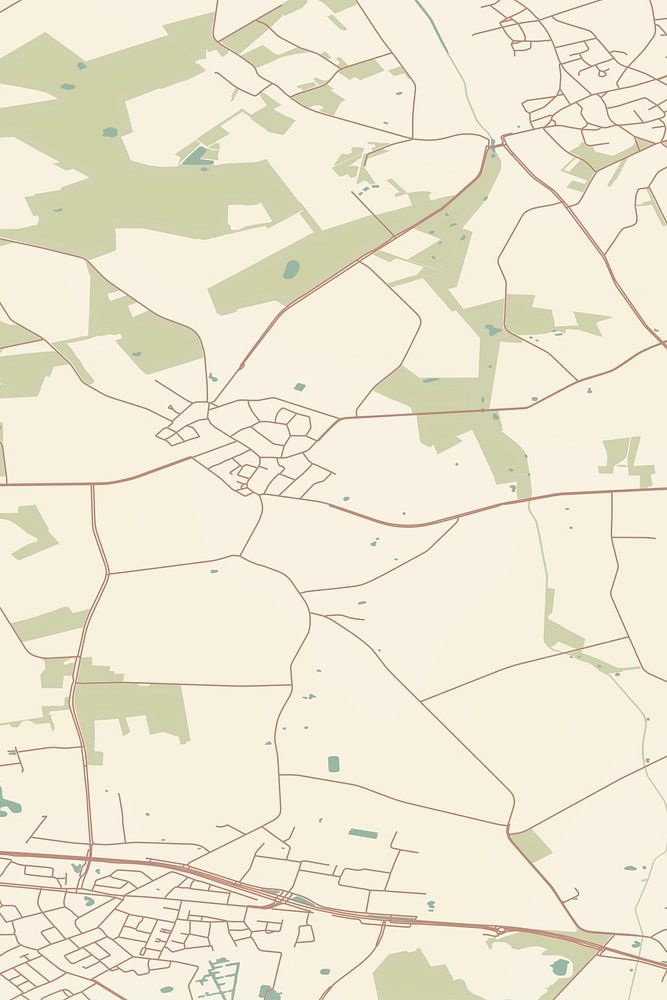 Retrokarte von Hoogeloon, gelegen in der Gemeinde Bladel, Provinz Nordbrabant. Die Karte zeigt öffentliche Straßen, Wasserläufe (Seen, Bäche und Gräben) und Wälder in und um Hoogeloon. Darüber hinaus enthält die Karte die Koordinaten von Hoogeloon.