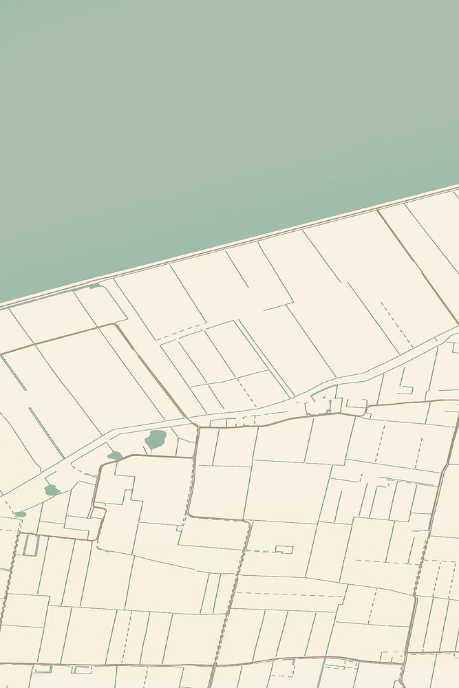 Retrokarte von Hornhuizen, gelegen in der Gemeinde Het Hogeland, Provinz Groningen. Die Karte zeigt öffentliche Straßen, Wasserläufe (Seen, Bäche und Gräben) und Wälder in und um Hornhuizen. Darüber hinaus enthält die Karte die Koordinaten von Hornhuizen.