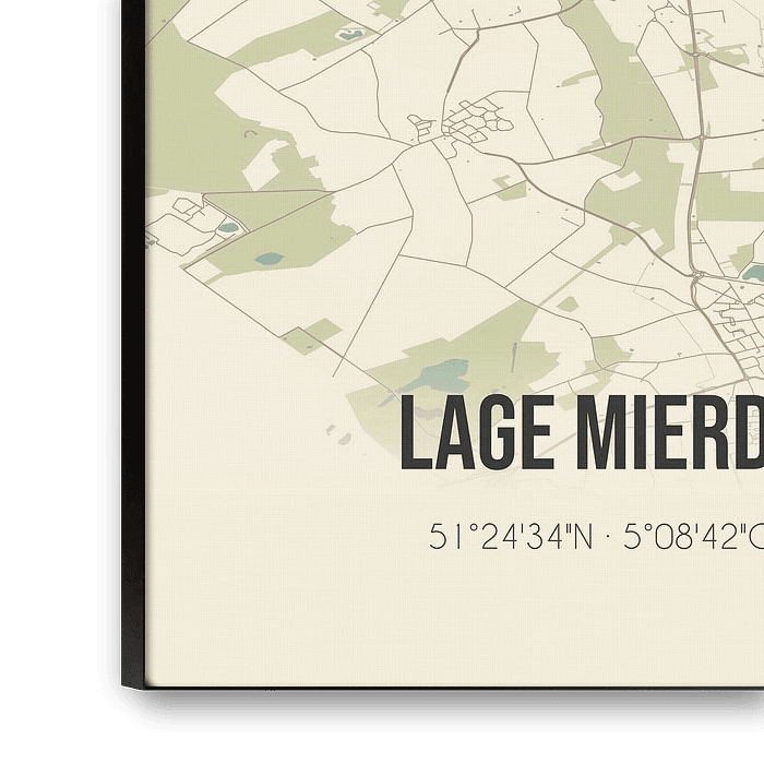 Retrokarte von Lage Mierde, gelegen in der Gemeinde Reusel-DeMierden, Provinz Nordbrabant. Die Karte zeigt öffentliche Straßen, Wasserläufe (Seen, Bäche und Gräben) und Wälder in und um Lage Mierde. Darüber hinaus enthält die Karte die Koordinaten von Lage Mierde.