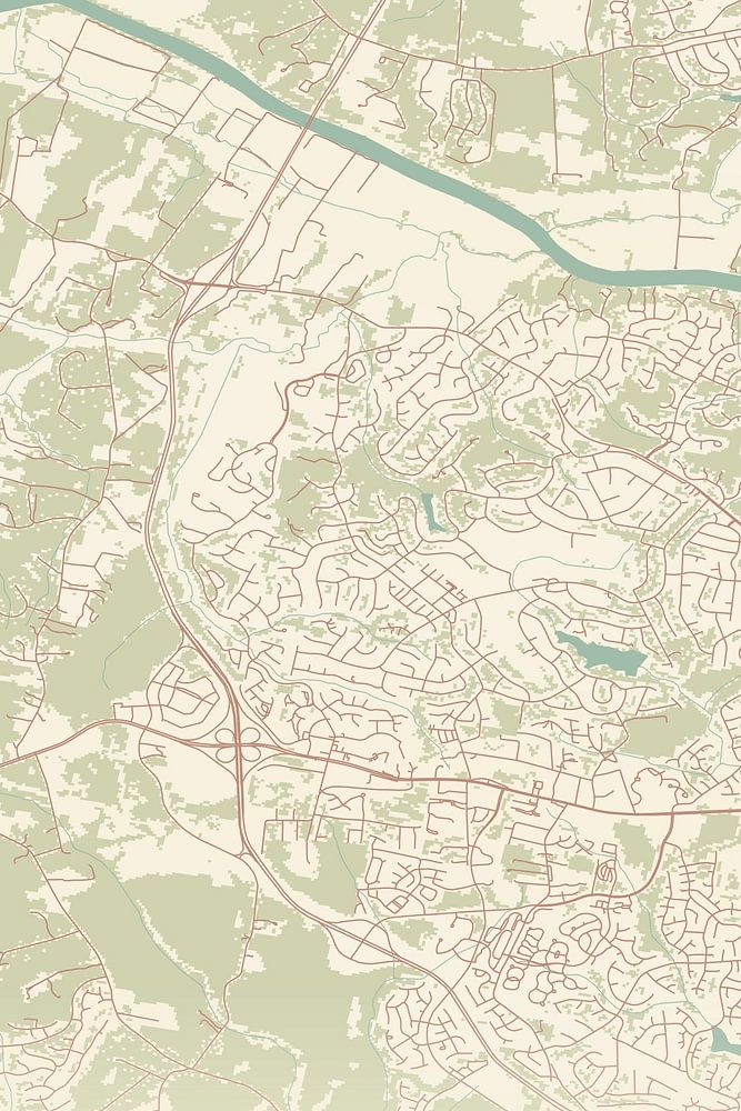 Die Karte ist ein echter Blickfang in Ihrem Zuhause, perfekt für den Liebhaber von Vintage-Dekoration. Wälder, Straßen, Seen, Flüsse und Bäche sind mit farbigen Akzenten dargestellt und lassen Sie von der Pracht und Eleganz dieses Ortes staunen.