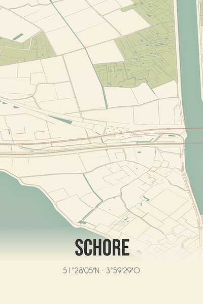 Retrokarte von Schore, gelegen in der Gemeinde Kapelle, Provinz Zeeland. Die Karte zeigt öffentliche Straßen, Wasserläufe (Seen, Bäche und Gräben) und Wälder in und um Schore. Darüber hinaus enthält die Karte die Koordinaten von Schore.