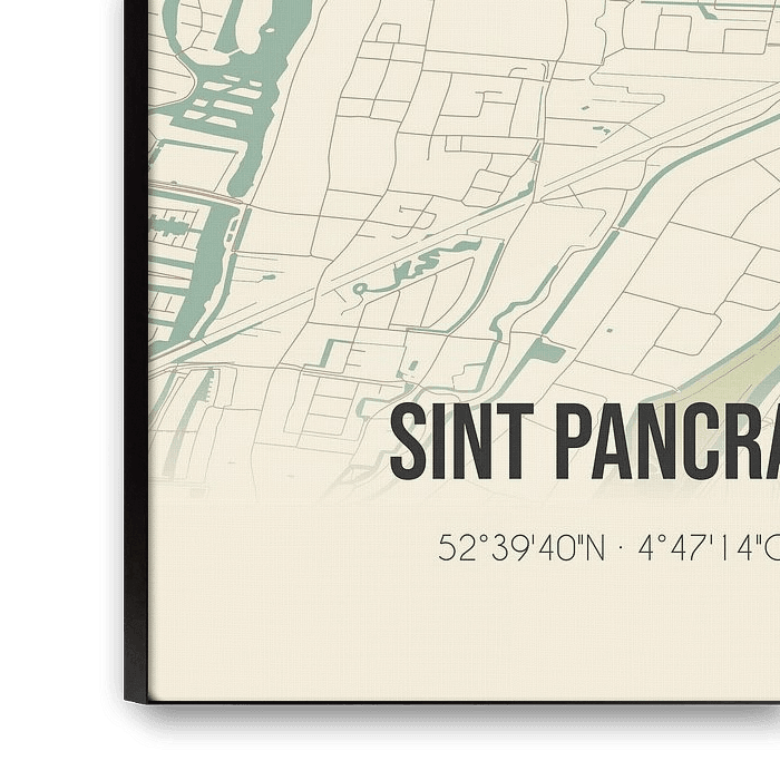 Retrokarte von Sint Pancras, gelegen in der Gemeinde Langedijk, Provinz Nordholland. Die Karte zeigt öffentliche Straßen, Wasserläufe (Seen, Bäche und Gräben) und Wälder in und um Sint Pancras. Darüber hinaus enthält die Karte die Koordinaten von Sint Pancras.