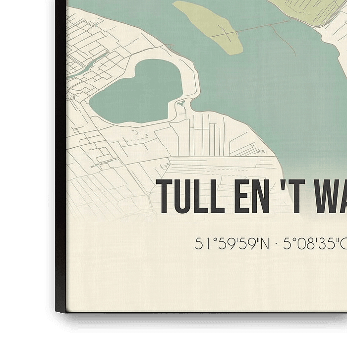 Retrokarte von Tull en 't Waal, gelegen in der Gemeinde Houten, Provinz Utrecht. Die Karte zeigt öffentliche Straßen, Wasserläufe (Seen, Bäche und Gräben) und Wälder in und um Tull en 't Waal. Darüber hinaus enthält die Karte die Koordinaten von Tull en 't Waal.