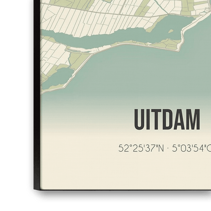 Retrokarte von Uitdam, gelegen in der Gemeinde Waterland, Provinz Nordholland. Die Karte zeigt öffentliche Straßen, Wasserläufe (Seen, Bäche und Gräben) und Wälder in und um Uitdam. Darüber hinaus enthält die Karte die Koordinaten von Uitdam.