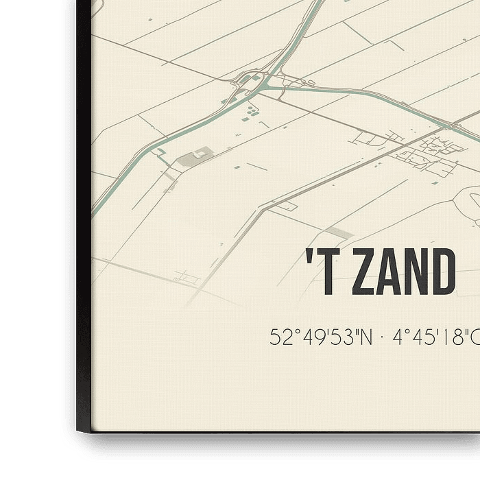 Retrokarte von 't Zand, gelegen in der Gemeinde Schagen, Provinz Nordholland. Die Karte zeigt öffentliche Straßen, Wasserläufe (Seen, Bäche und Gräben) und Wälder in und um 't Zand. Darüber hinaus enthält die Karte die Koordinaten von 't Zand.