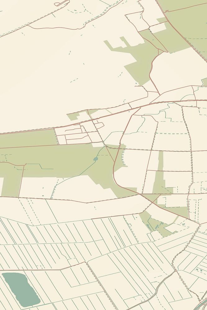 Retrokarte von Darp, gelegen in der Gemeinde Westerveld, Provinz Drenthe. Die Karte zeigt öffentliche Straßen, Wasserläufe (Seen, Bäche und Gräben) und Wälder in und um Darp. Darüber hinaus enthält die Karte die Koordinaten von Darp.