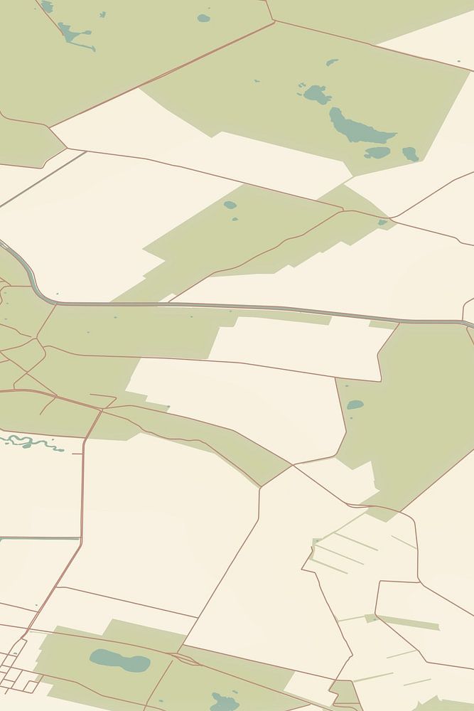 Retrokarte von Orvelte, gelegen in der Gemeinde Midden-Drenthe, Provinz Drenthe. Die Karte zeigt öffentliche Straßen, Wasserläufe (Seen, Bäche und Gräben) und Wälder in und um Orvelte. Außerdem enthält die Karte die Koordinaten von Orvelte.