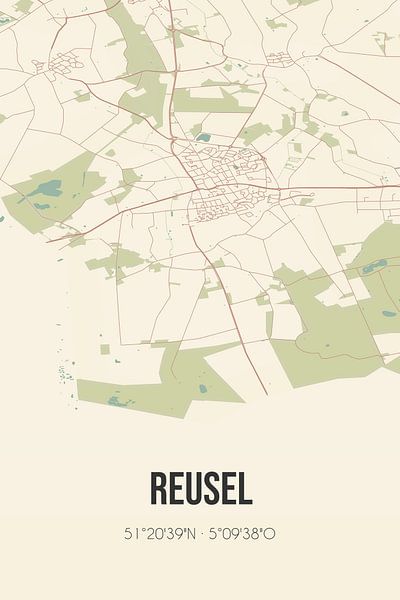 Retrokarte von Reusel, gelegen in der Gemeinde Reusel-DeMierden, Provinz Nordbrabant. Die Karte zeigt öffentliche Straßen, Wasserläufe (Seen, Bäche und Gräben) und Wälder in und um Reusel. Darüber hinaus enthält die Karte die Koordinaten von Reusel.