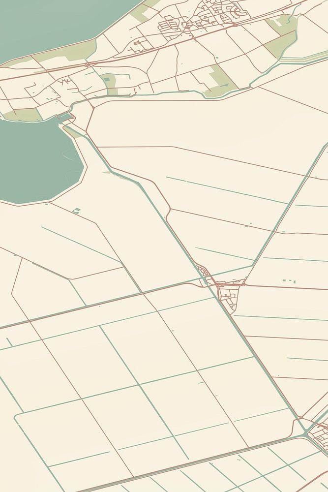 Retrokarte von Slootdorp, gelegen in der Gemeinde Hollands Kroon, Provinz Nordholland. Die Karte zeigt öffentliche Straßen, Wasserläufe (Seen, Bäche und Gräben) und Wälder in und um Slootdorp. Darüber hinaus enthält die Karte die Koordinaten von Slootdorp.